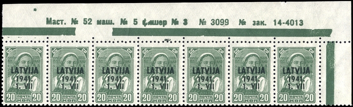 1941, 20 K. grün, postfrischer Siebenerstreifen vom Oberrand mit Druckvermerk