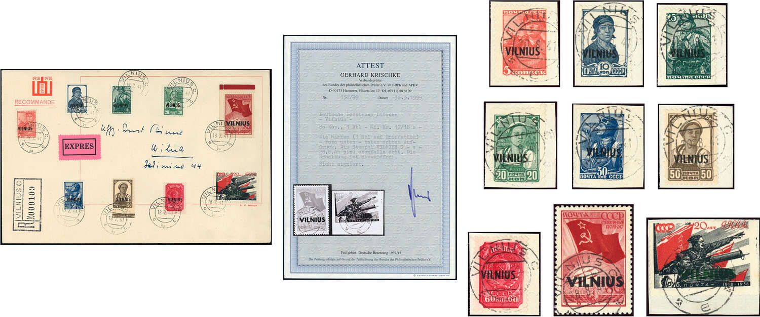 1941, 9 Werte Freimarken und Sondermarken der Sowjetunion mit Überdruck als kompletter Satz auf adressiertem Einschreiben- Eilbotenbrief. Weiterhin der komplette Satz gestempelt bzw. auf Briefstückchen, hierfür Fotoattest Krischke BPP "echt und einwandfrei" für die beiden Höchstwerte. Die Werte von 5 bis 60 K. sind ebenfalls geprüft Krischke BPP