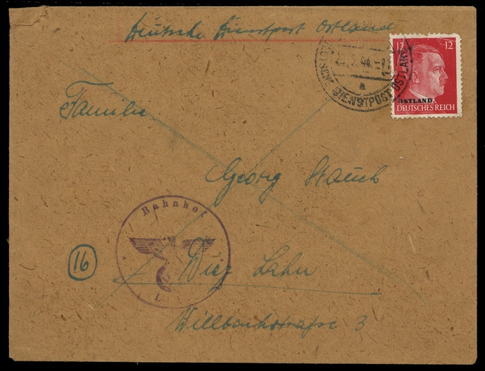 1941, 12 Pfg. Hitler mit Aufdruck, Mängel, auf Brief aus "LIDA DEUTSCHE DIENSTPOST OSTLAND 23.2.44" nach Diez/Lahn, ng. viol. Dienststempel "Bahnhof Lida", Beförderungsspuren