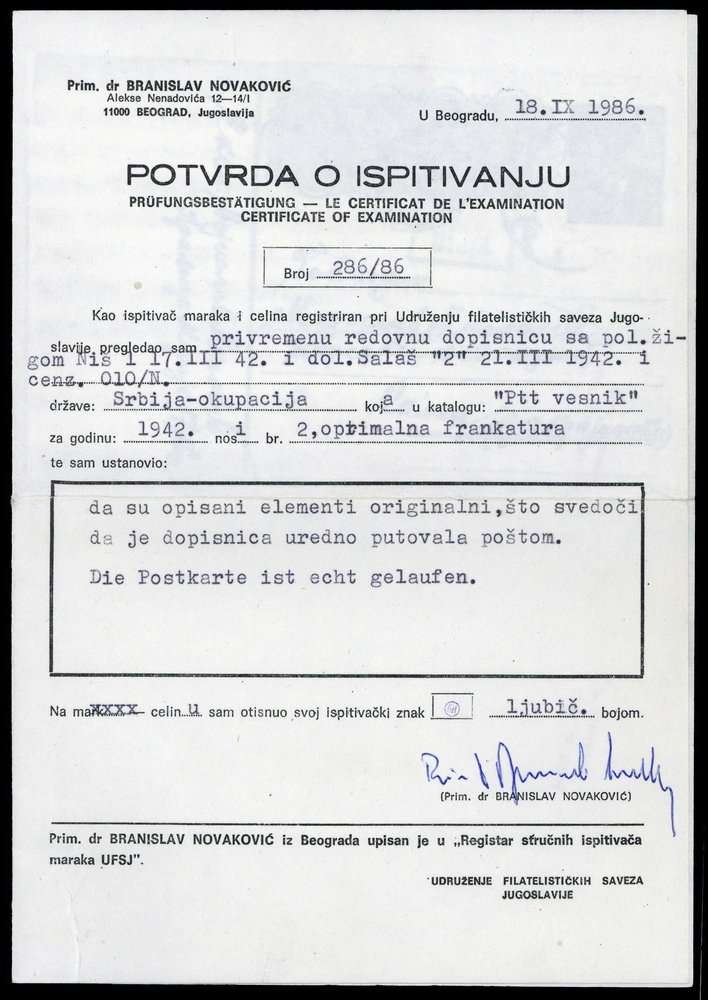 1941, 1 Din. Aufdruck-Ganzsache, bedarfsgebraucht von NIS 1 - 17.III.42, violetter Zensurstpl., älteres Fotoattest Novakovic / Belgrad.