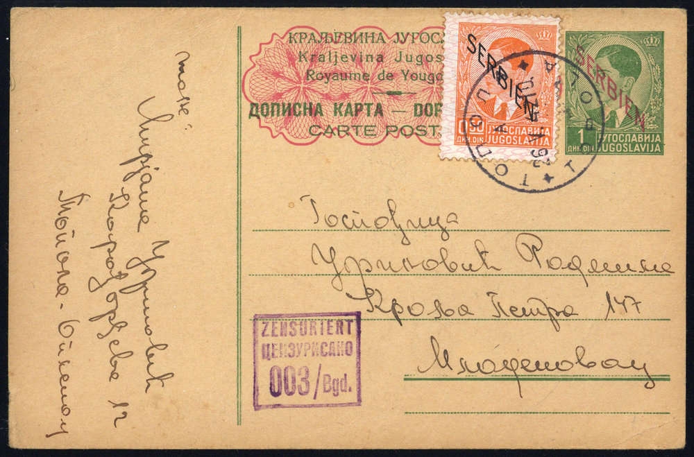 1941, 1 Din grün mit 0.50 D. orange von "Topola 26.V.42" mit violettem Ra3 "Zensuriert 003/Bgd."