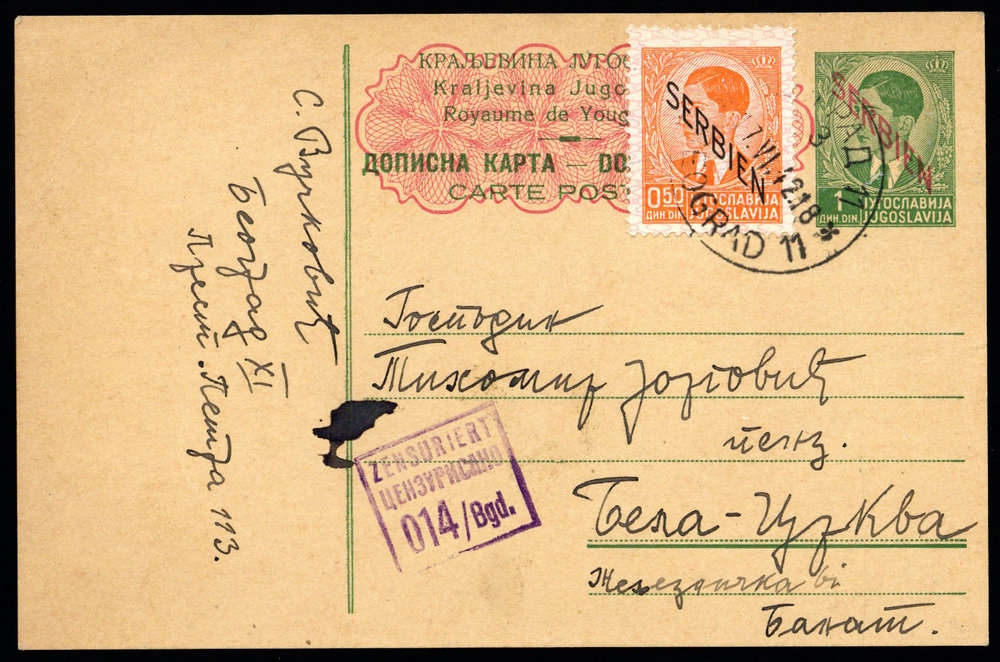 1941, 1 D. grün mit 0.50 D. orange mit "Zensuriert 014/Bgd." von "Belgrad 17.VI.42"