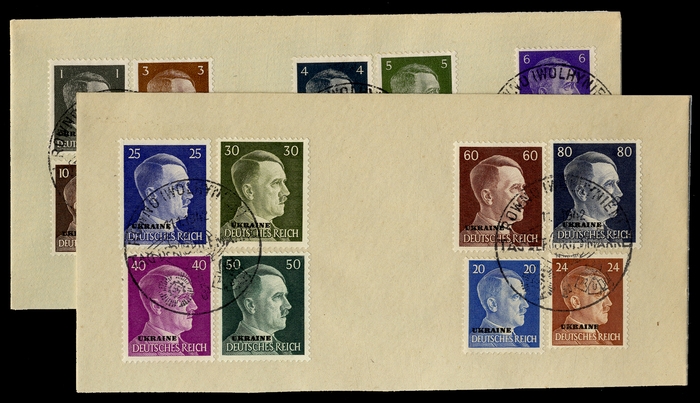1941, 1-80 Pfg. Hitler auf zwei Briefstücken mit SST "Rowno 11.1.42 Tag der Briefmarke"