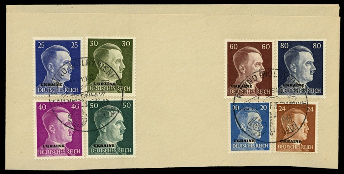 1941, 1-80 Pfg. Hitler auf zwei Briefstücken mit SST "Rowno 11.1.42 Tag der Briefmarke"