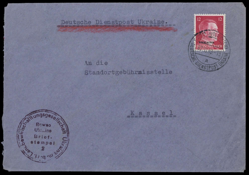 1941, 12 Pfg. Hitleraufdruck auf Bedarfsbrief von ROWNO 30.10.1942, adressiert nach Kassel, schwarzer Briefstempel "Landwirtschaftsgesellschaft Ukraine", rückseitig leichte Befestigungsspuren.