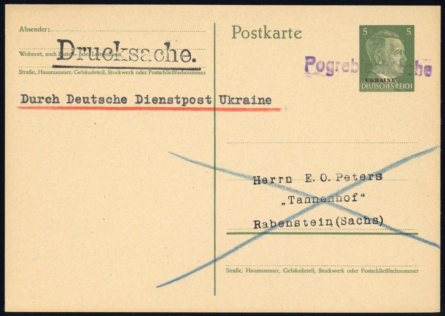 1941, 5 Pfg. Hitler-Aufdruck Ganzsache als Drucksache (kein Absender oder rs. Text) mit violettem Einzeiler "Pogreblschtsche" nach Rabenstein / Sachsen, leichte Alterungsspuren.