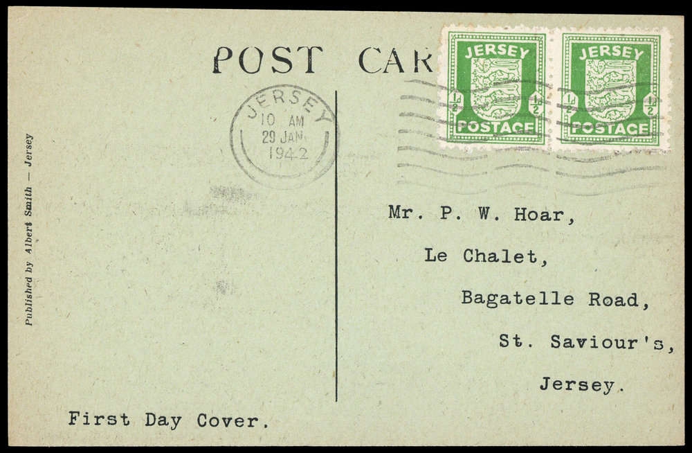 1942, 1/2 P. Wappen im waagerechten Paar auf AK "Weighbridge Potato Season" phil. mit Maschinenstempel "Jersey 29 Jan 1942", leichte Alterungsspuren