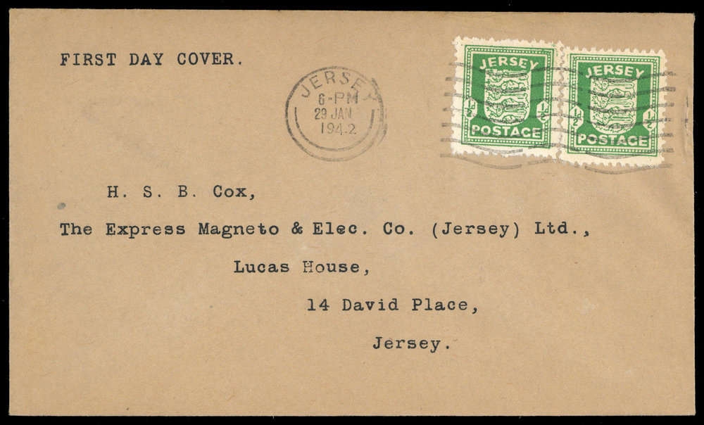 1942, 1/2 P. Wappen, zwei Werte (1 Wert Zahnfehler) auf FDC mit Ersttagsstempel "JERSEY 29.1.1942" (Maschinenstempel), adressiert nach Jersey, geprüft Möhle BPP.