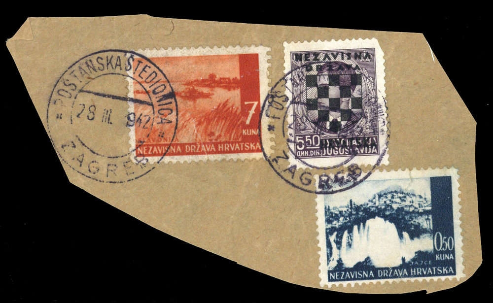 1942, Postsparkassen-Stempel, Briefstück, freigemacht für ein Einschreiben mit 13,-- Kn. (Mi.-Nr. 17, 48, 58) Stempel der Postsparkasse Zagreb vom 29.3.42.