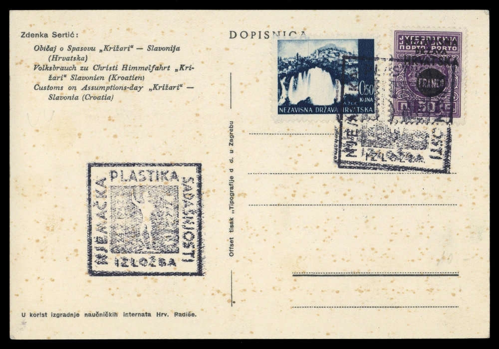 1942, Bildpostkarte (kroat. Volksbrauch "Himmelfahrt") mit dem seltenen Hand-Sonderstempel zur Ausstellung "Deutsche Plastik der Gegenwart" Etwas fleckig.