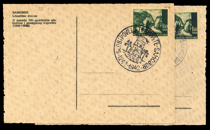 1942, Zwei Sonder-Postkarten zur 700 Jahr-Feier der Stadt Samobor mit entsprechendem Sonderstempel vom 20.12.1942. 1x überdurchschnittlich sauberer Abschlag des Sonderstempels und einwandfreie Erhaltung, 1x Karte etwas bügig, sonst einwandfreie Erhaltung. Saubere Stempelabschläge auf diesem problematischen Karton sind außerordentlich selten zu finden.