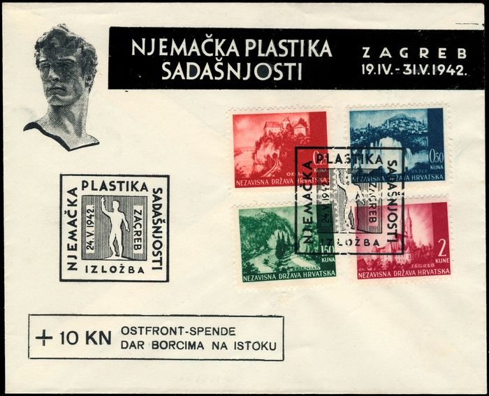 1942, Sonderumschlag zur Ausstellung "Deutsche Plastik der Gegenwart" mit entsprechendem Maschinen-Sonderstempel und dem seltenen Zusatzstempel "10 Kuna Ostfront-Spende". Einwandfreie Erhaltung