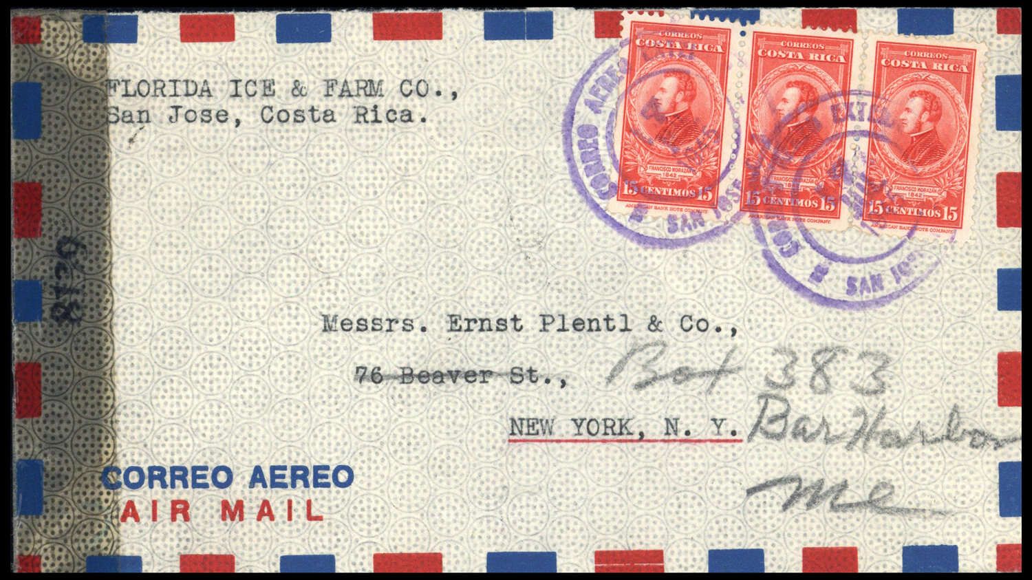 1943, 15 C orangerot (3), MeF auf Luftpostbrief, K2 "SAN JOSE 7 JUL 1945", mit US-Tesazensur, Beförderungsspuren, Ak "NY JUL 12 1945"