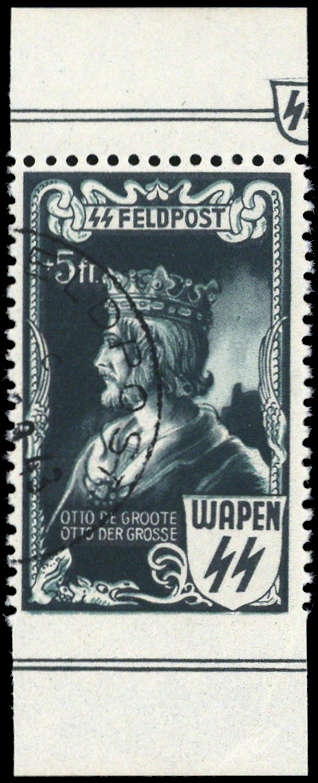 1943, +5 Fr. Kaiserbildnis mit Gefälligkeitsentwertung und der markanten Abart "unten ungezähnt". In dieser Form im Michel-Spezial 2016 nicht katalogisiert!