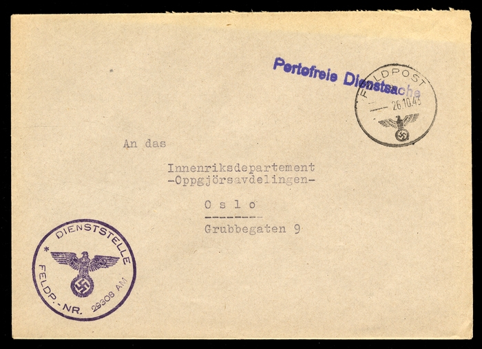 1943, Portofreie Dienstsache von FP-Nr.: 29308 vom 26.10.43 nach Oslo (Norwegen)