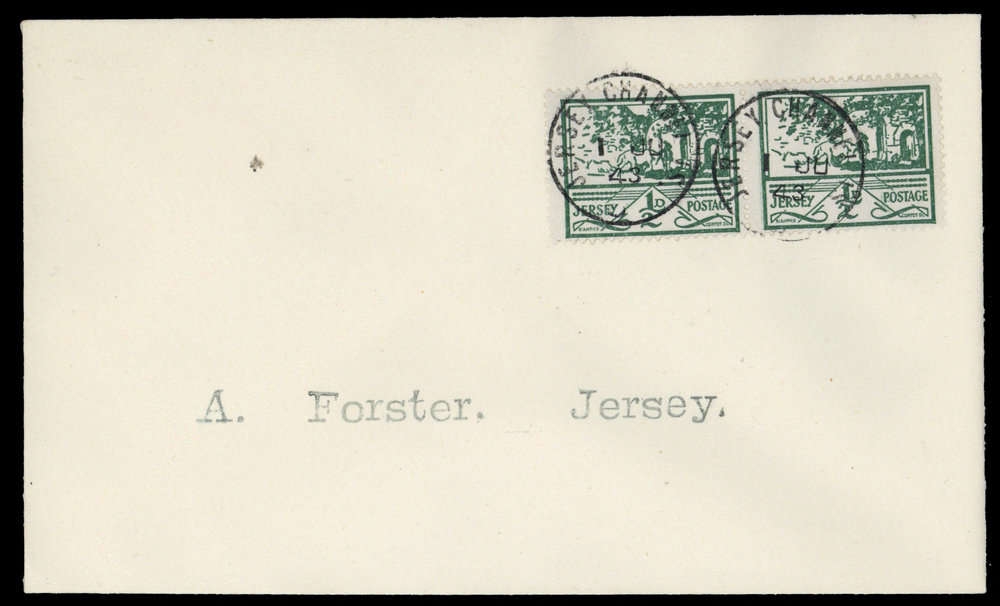 1943, 1/2 P. Ansichten, waagerechtes Paar auf FDC von JERSEY 1.6.43, adressiert nach Jersey.