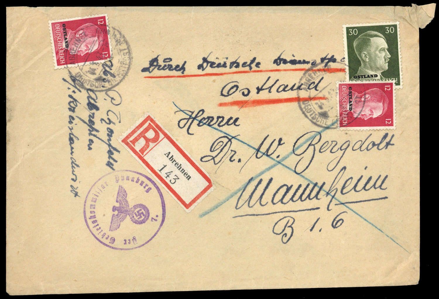 1943, 12 + 12 + 30 Pfg. Hitler-Aufdruck (etwas übereinander verklebt) zusammen auf R-Brief von ABREHNEN 14.5.43 - DEUTSCHE DIENSTPOST OSTLAND nach Mannheim, rs. Ankunftsstpl., nebengesetzt violetter Briefstpl. "Der Gebietskommissar Dünaburg", Beförderungsspuren.