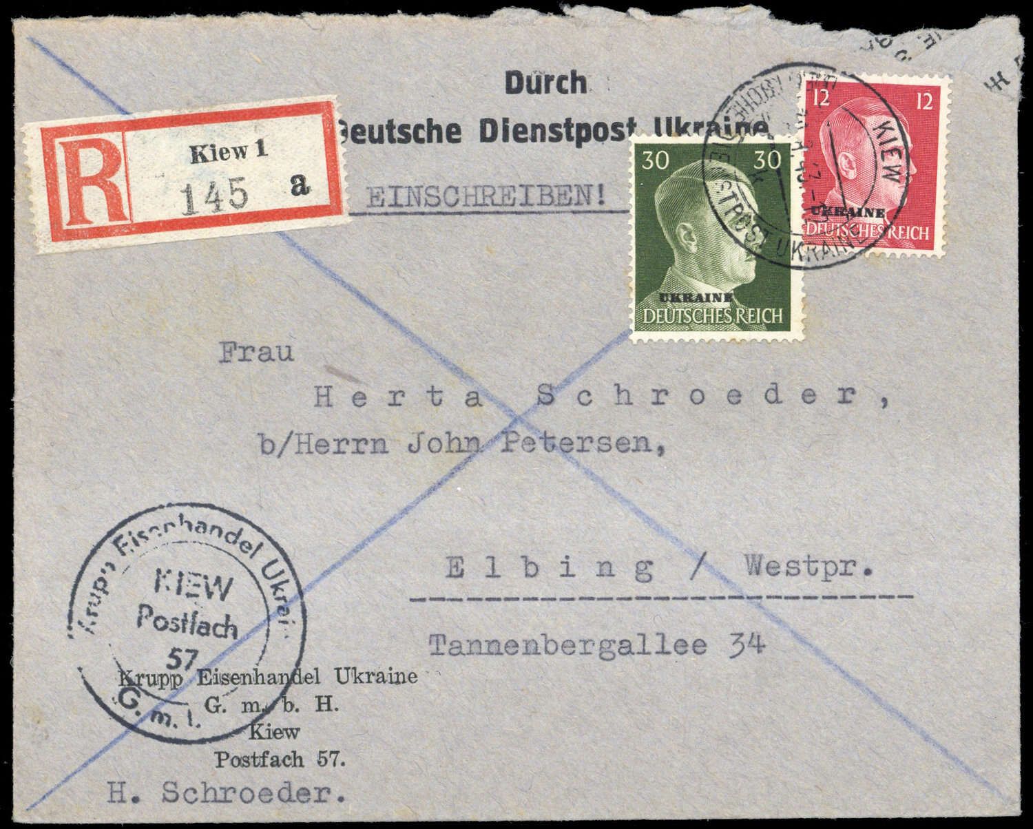 1943, 12 Pf und 30 Pf Hitler mit Aufdruck Ukraine auf R-Brief vom 29.08.1943 von Kiew 1 nach Elbing, Westpr., Öffnungsmängel, Alterungsspuren