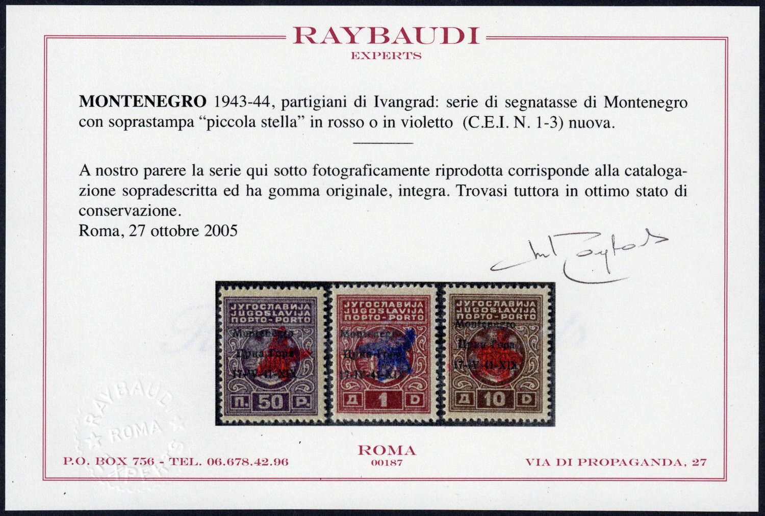 1943, 3 Werte der Partisanenausgabe Ivangrad (Berane) als kompletter seltener postfrischer Satz mit Überdruck "kleiner Stern" auf Montenegro- Marken. Jeder Wert signiert und für den kompletten Satz Farbfotoattest Raybaudi/Rom "echt und einwandfrei" (Katalog CEI - Segnatasse 1-3)