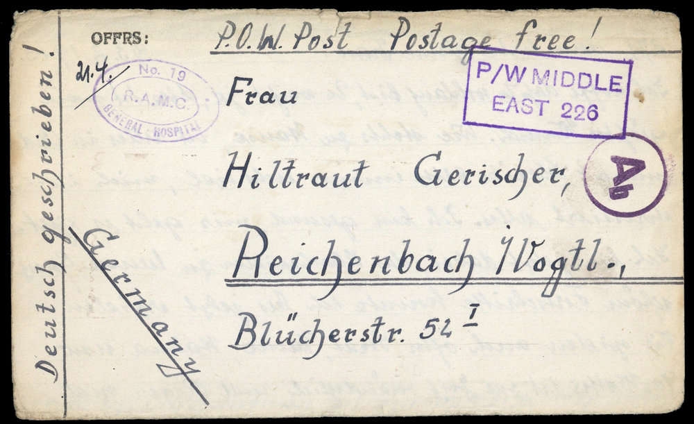 1943, Kriegsgefangenen-Faltbrief, viol. Oval "R.A.M.C. No.19 GENERAL HOSPITAL", Ra2 "P/W MIDDLE EAST 226", Zensur-K1 "Ab", Alters- Beförderungsspuren, nach Reichenbach/Vogtland