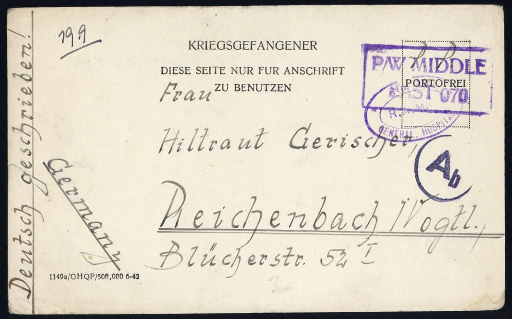 1943, Kriegsgefangenen-Karte, viol. Oval "R.A.M.C. No.19 GENERAL HOSPITAL", Ra2 "P/W MIDDLE EAST 070", Zensur-K1 "Ab", Alters- Beförderungsspuren, nach Reichenbach/Vogtland
