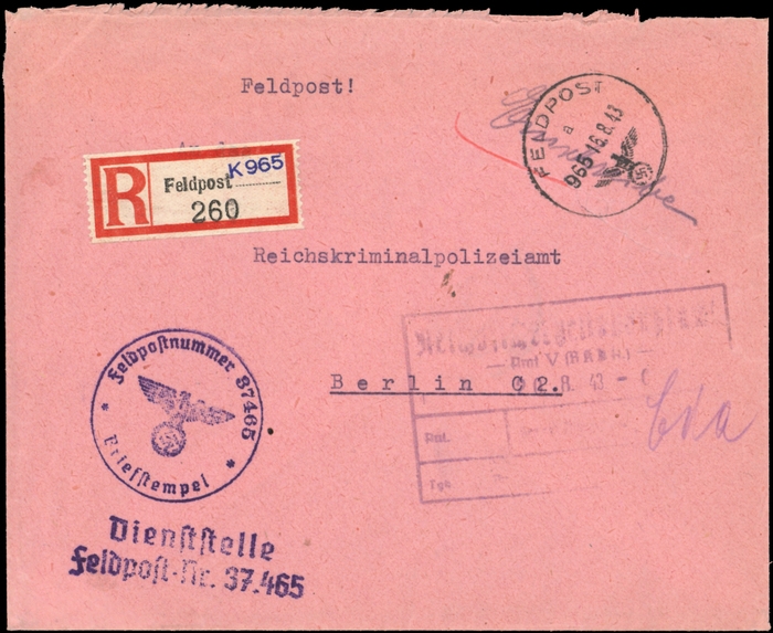 1943, Kroat. Legions-Divisionen. Feldpost-Einschreiben (Kenn.-Nr. 965 des FPA 369 -kroat.-) von der Einheit FpNr. 37465 (4. Fahr-Kolonne der 369. Inf.-Div. - kroat. -) Feldpost-Stempel Ub "a" vom 16.8.1943, nach Berlin. Kampfeinsatz in Kroatien. Einwandfreie Bedarfserhaltung. Einschreiben der Legions-Divisionen sind selten. Michel Feldpost-Katalog S. 294, B.1-5e