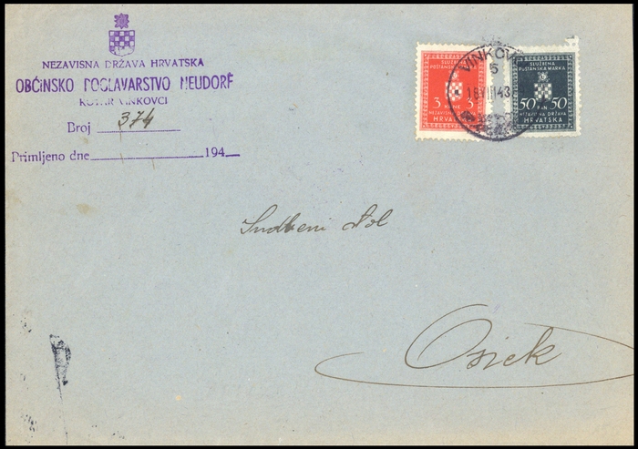 1943, Dienstbrief des Bürgermeisteramtes NEUDORF (ex- Vinkovacko Novo Selo) vom 18.8.43 (Poststempel Vinkovci), an die Gemeindeverwaltung in Osijek, portorichtig freigemacht mit 3,50 Kn. in Dienstmarken, rückseitig deutschsprachiges Siegel des Gemeindeamtes Neudorf. Neudorf erhielt erst am 16.10.1943 ein eigenes Postamt mit deutschsprachigen Poststempeln, und war einer der nur vier Orte in Kroatien mit deutschprachigen Poststempeln! Seltener Beleg.