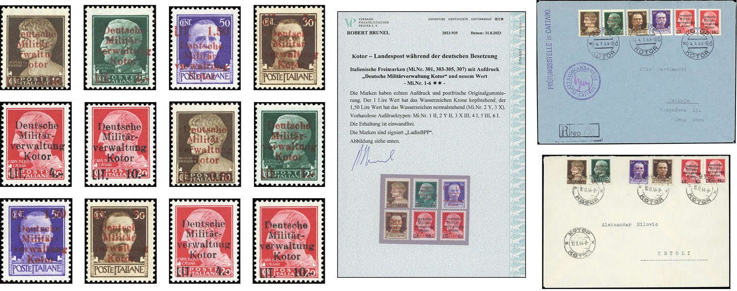 1944, die erste Serie von der Landespost während der deutschen Besetzung in Kotor zu insgesamt 4 Sätzen, davon 2 auf Briefen. Zwei postfrische Serien, dabei eine mit Farbfotoattest von dem Experten Robert Brunel / Kaufbeuren "echt und einwandfrei"