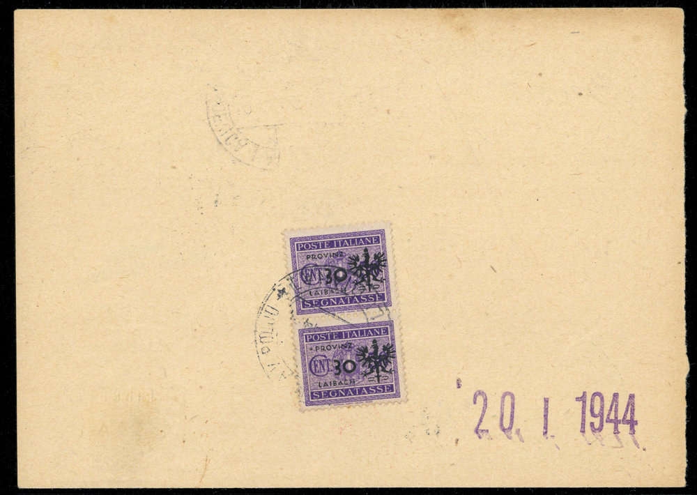 1944, 30.a.50C. Portomarke, senkrechtes Paar rückseitig auf POSTANWEISUNG vom 19.1.1944, diverse Stempelvermerke, leichte Alterungsspuren.