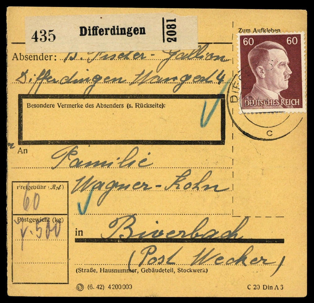 1944, 60 Pfg. Hitler auf Paketkarte (7,5 KG) von Differdingen 29.4.44 nach Biverbach