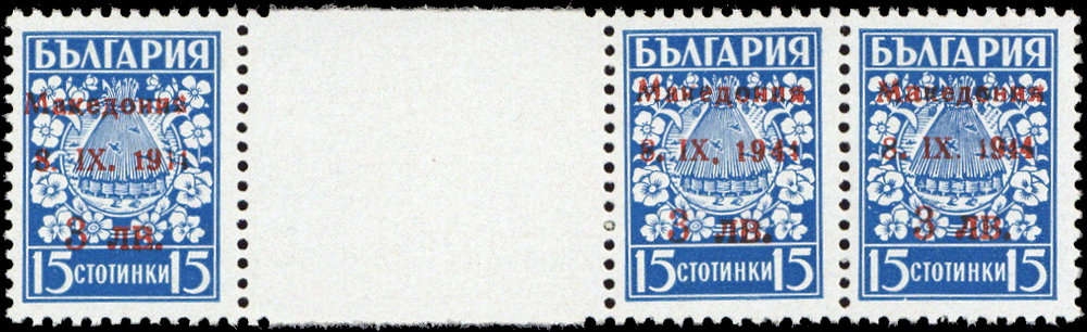 1944, 3 L. Freimarke von Bulgarien mit Aufdruck in Type "II" als tadellos postfrisches Zwischenstegpaar (ME 600.-)