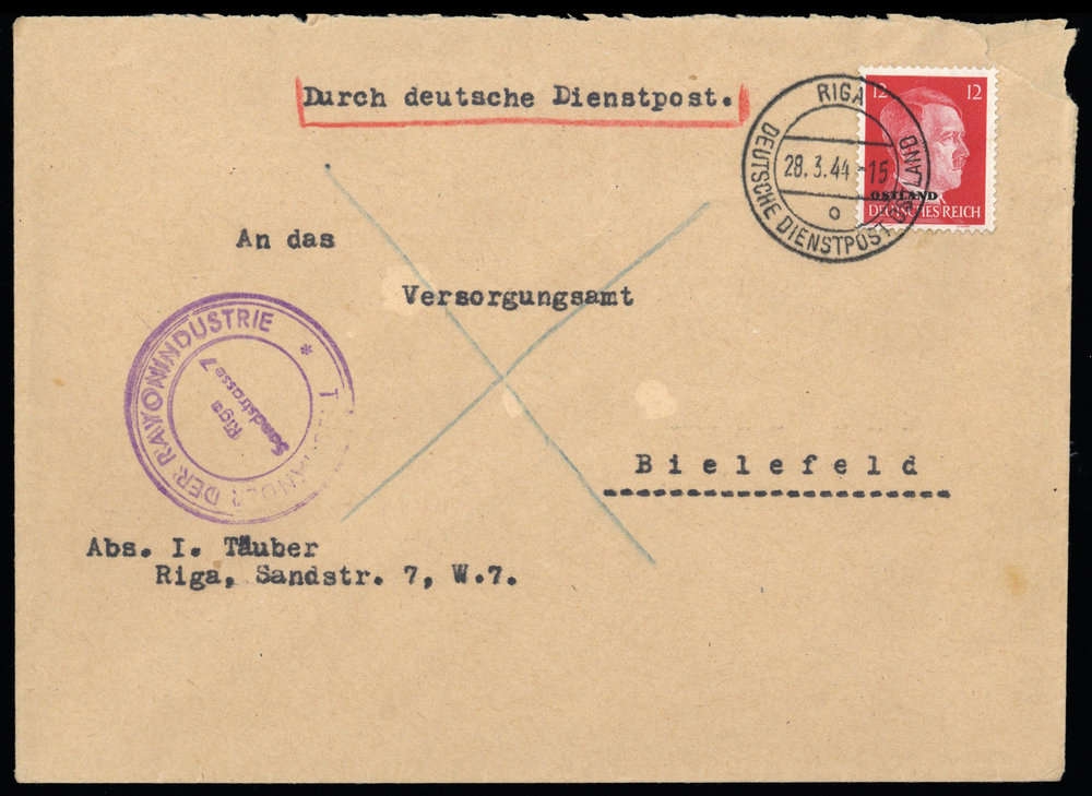 1944, 12 Pfg. Hitleraufdruck auf Brief mit Stpl. "RIGA 28.3.44 DEUTSCHE DIENSTPOST OSTLAND" nach Bielefeld, violetter Briefstpl. "RAYONINDUSTRIE", Brief rechts oben Eckfehler.
