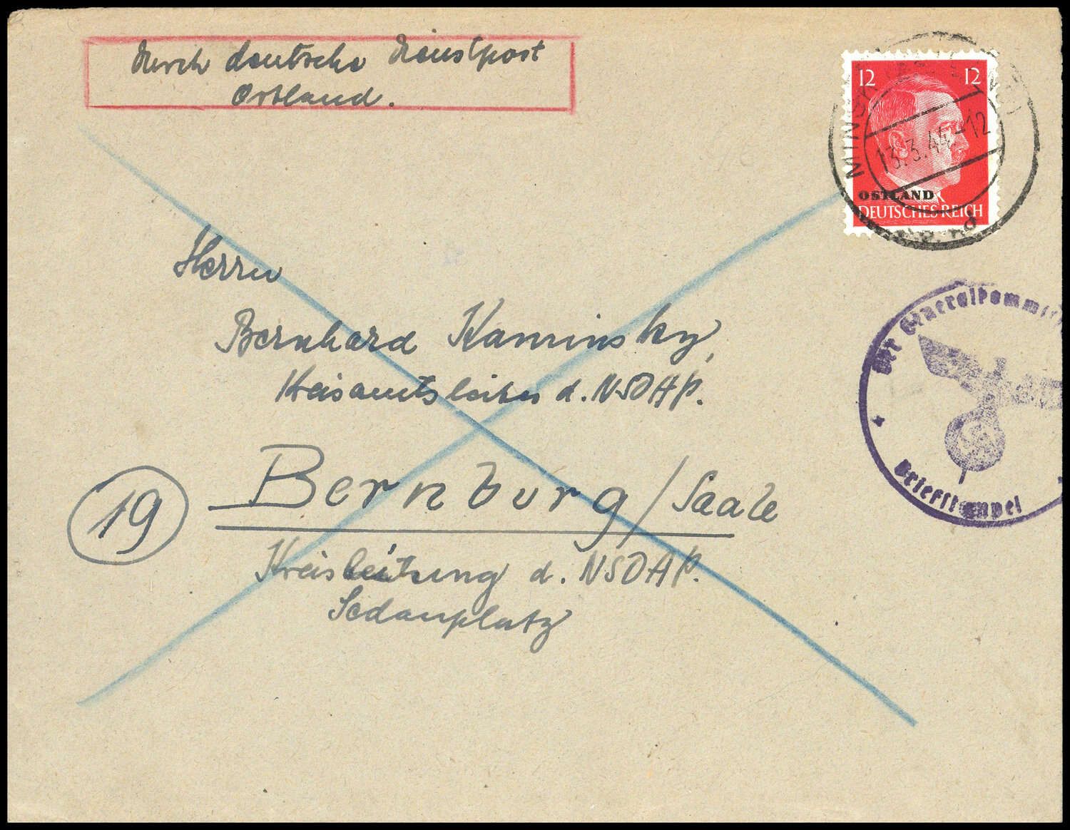 1944, 12 Pfg. Hitler-Aufdruck auf Bedarfsbrief von MINSK 13.3.44 nach Bernburg / Saale, nebengesetzt violetter Briefstpl. "Der Generalkommissar", leichte rs. Befestigungsspuren + Randalterungsspuren.