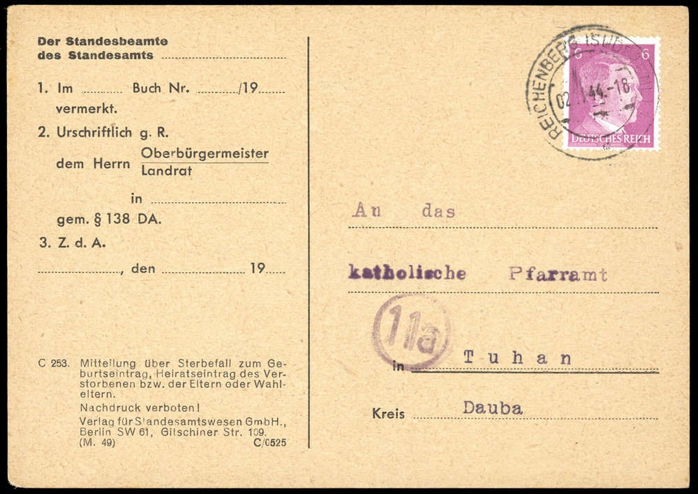 1944, 6 Pfg. Hitler auf Bedarfskarte des Standesamtes von "Reichenberg 2.11.44" nach Tuhan
