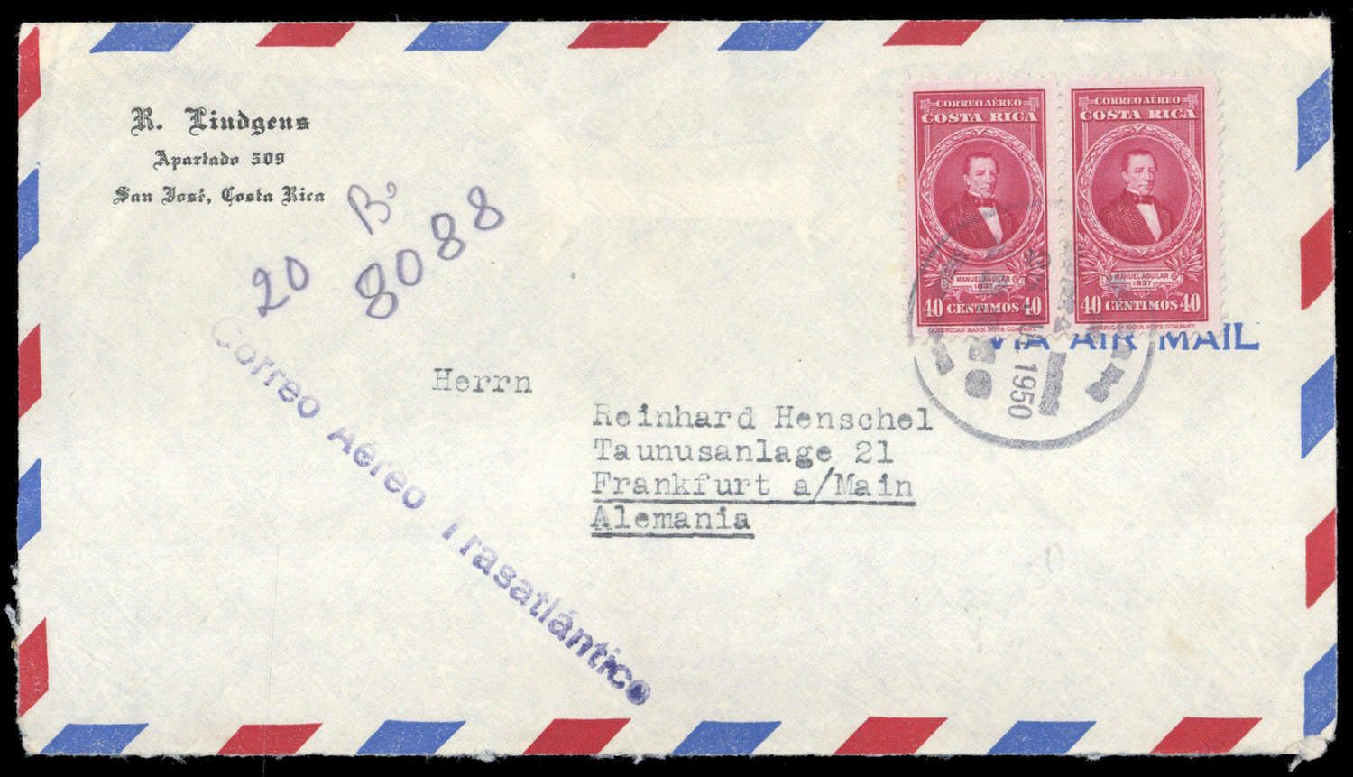 1945, 40 C karminrosa, (2), MeF auf Luftpostbrief, K1 "SAN JOSE 28 JUL 1950", Beförderungsspuren, nach Frankfurt
