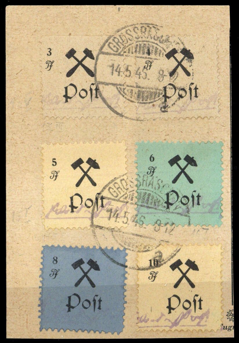 1945, 3-10 Pfg. Freimarken, gestempelt auf Briefstück, dabei 3 Pfg. in Type III und 5 Pfg. Plattenfehler I "P offen"