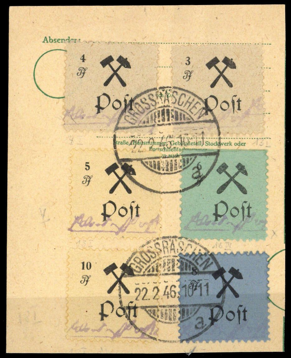1945, 3-10 Pfg. Freimarken, gestempelt auf Briefstück, dabei 6 Pfg. in Type III
