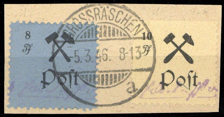 1945, 8 und 10 Pfg. Freimarken, gestempelt auf Briefstück