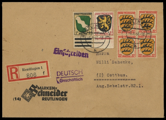 1945/46, 1 und 3 Pfg. je vom Unterrand sowie 4mal 20 Pfg. Wappen auf portoger. R-Brief aus "REUTLINGEN 6.4.46" nach Cottbus, Beförderungs-und leichte Alterungsspuren