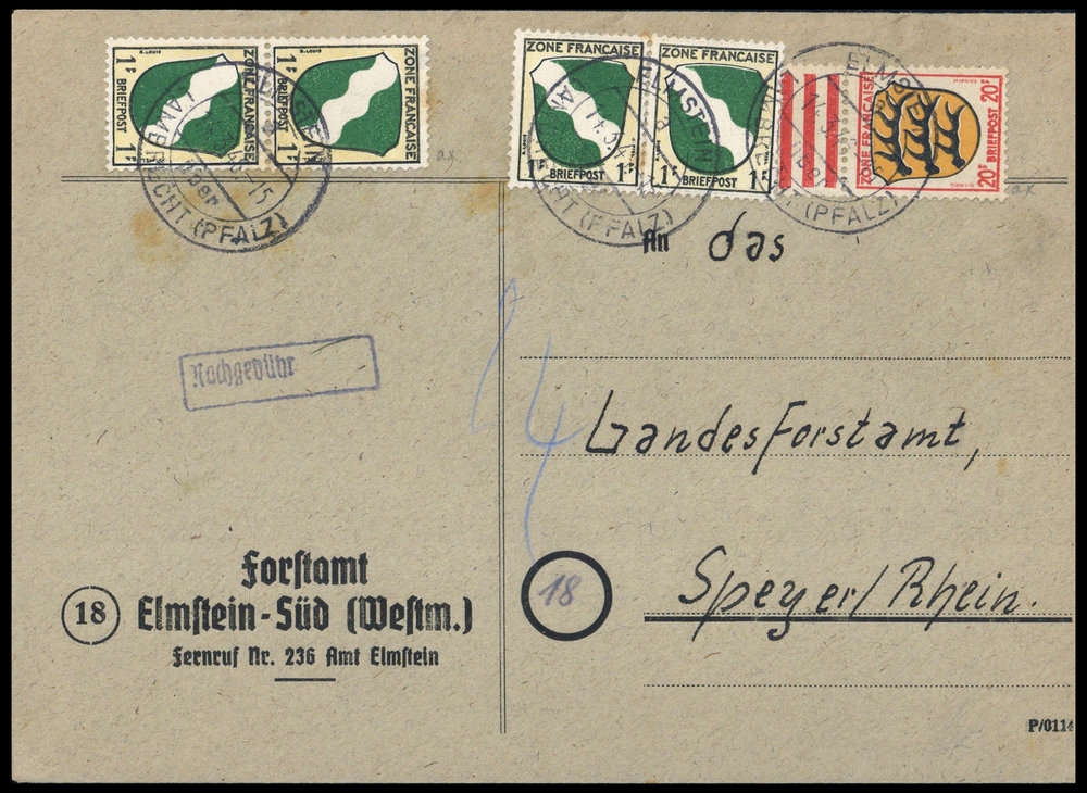 1945, 1 (4) und 20 Pf Wappen, Amtsbrief mit K2 "ELMSTEIN 14.3.46 über LAMBRECHT", Neben-Ra1 "Nachgebühr", hs. "24", Alters- Beförderungsspuren, nach Speyer