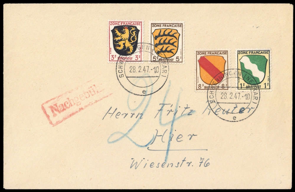 1945, 1+3+5+8 Pfg. Wappen zusammen auf Orts-Brief von SCHWENNINGEN (NECKAR) 28.2.1947, hds. Nachportovermerk "24" und roter Ra1 "Nachgebühr" .