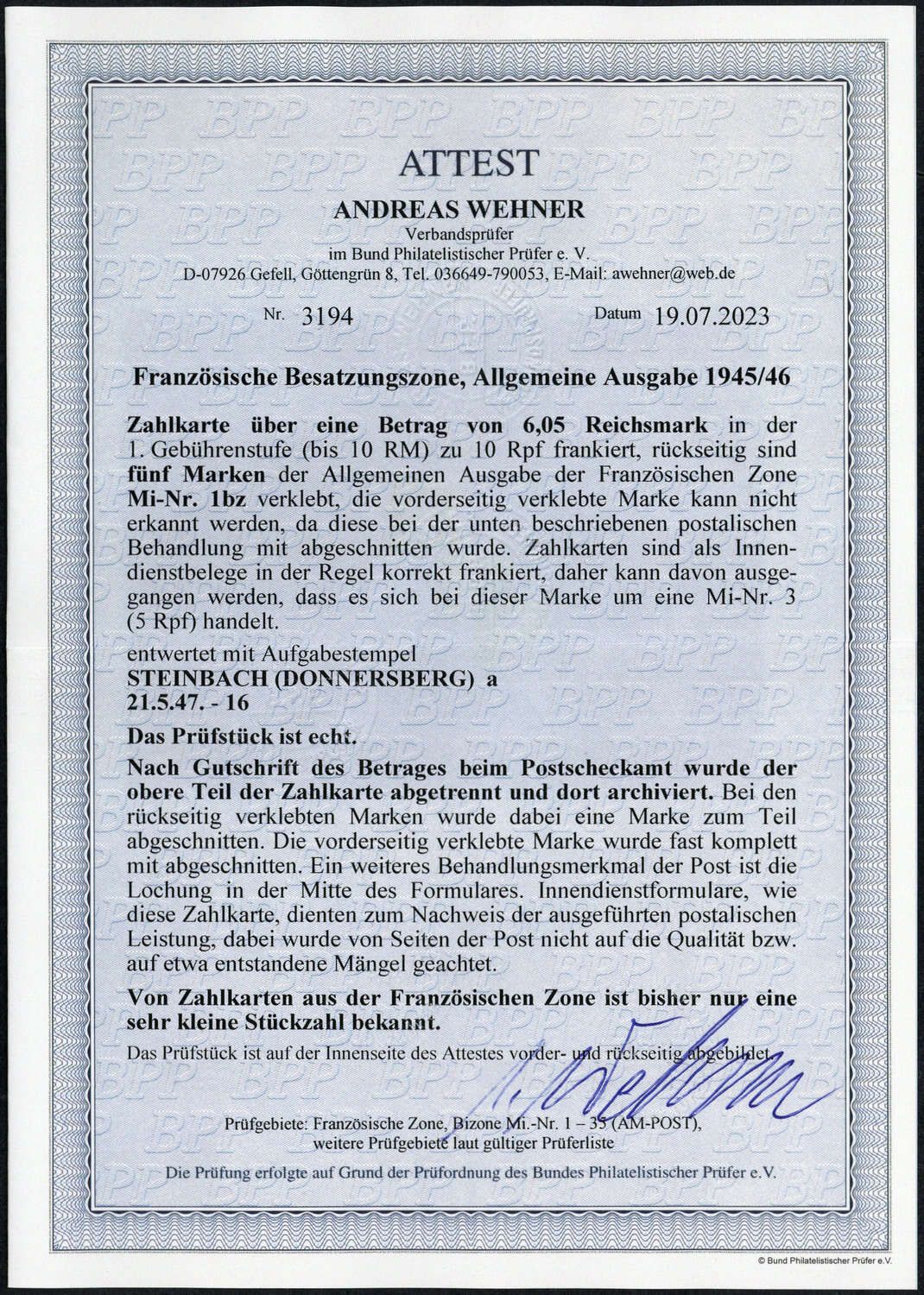1945, 1 Pfennig Freimarke Wappen "Rheinland" zu 5 Stück und abgetrennte 5 Pfennig Freimarke auf seltener portogerechter Mischfrankatur- Zahlkarte. Ausgeführte Zahlkarten sind generell amtlich beschnitten und gelocht, vorderseitige 5 Pfg.- Marke abgetrennt, bei den rückseitigen fünf Marken ist eine Marke beschnitten und eine gelocht. Nach Gutschrift des Betrages beim Postscheckamt wurde der obere Teil der Zahlkarte abgetrennt und dort archiviert. Aktuelles Farbfotoattest Wehner BPP vom 19.07.2023 "...echt ..... Von Zahlkarten aus der Französischen Zone ist bisher nur eine sehr kleine Stückzahl bekannt ....."