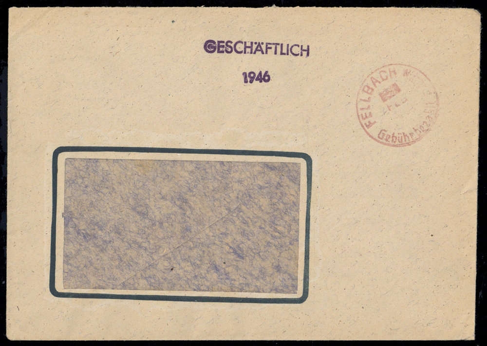 1945, Fensterkuvert mit rotem K1 ohne JAHRESZAHL "FELLBACH FEB Gebühr bezahlt", rechts kleiner Einriss.
