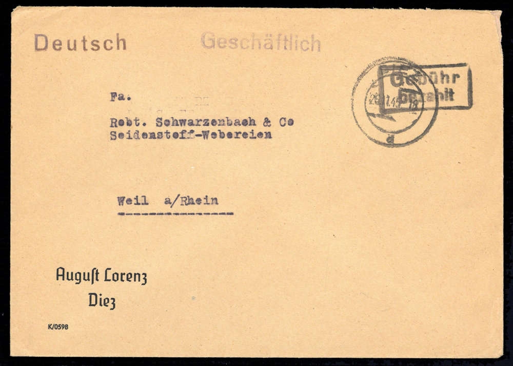 1945, Brief mit Stempel "DIEZ 26.11.1945" und schwarzer Ra2 "Gebühr bezahlt", adressiert nach Weil / Rhein.