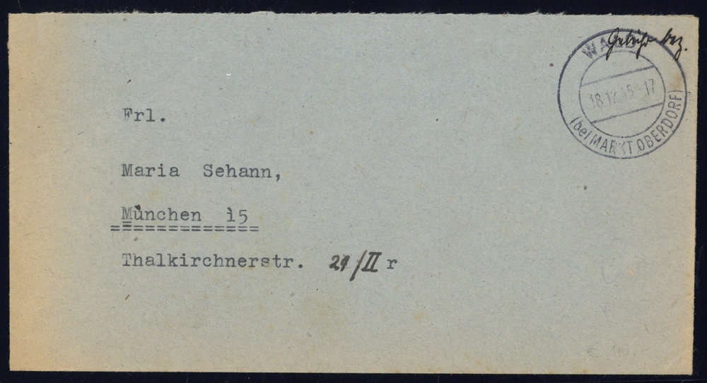 1945, Brief mit Stempel "WALD 18.12.1945 (bei MARKT OBERDORF)" und hds. "Gebühr bezahlt", adressiert nach München, Kuvert Alterungsspuren.