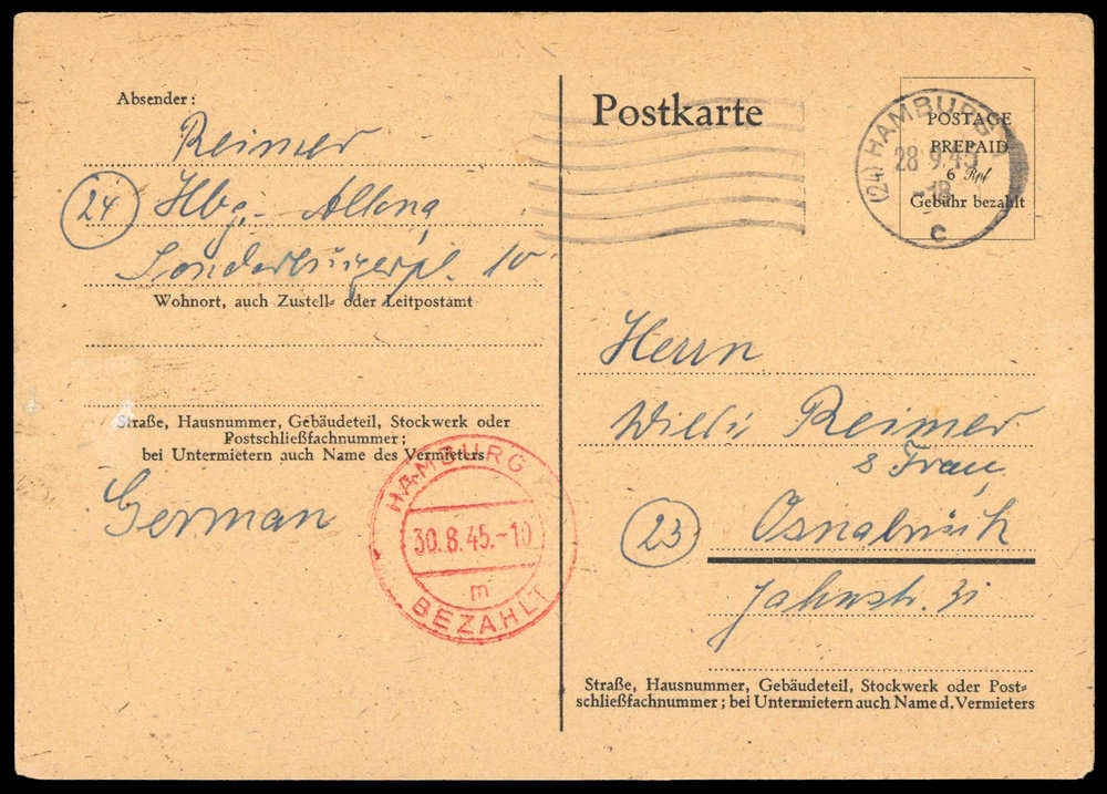 1945, 6 Rpf. Behelfs-Ganzsache mit Rollenstpl. "HAMBURG 28.9.1945", adressiert nach Osnabrück, ferner roter Stpl. "HAMBURG 30.8.1945 BEZAHLT", vs. Alterungsspuren.