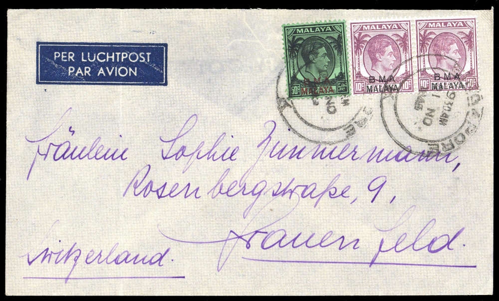 1945, 50 C schwarz/grün und 10 C lila (2), Aufdrucke "BMA MALAYA", Luftpostbrief, K2 "SINGAPORE 21 NO 1946", links senkr. Faltung, nach Frauenfeld/CH