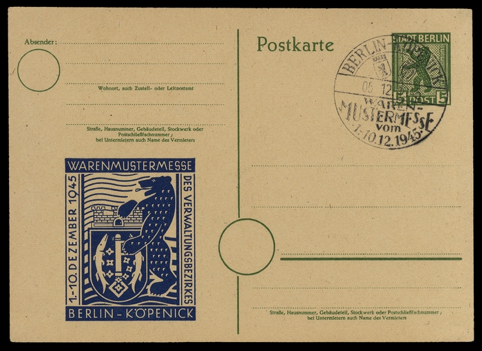 1945, 5 Pfg. grün mit Werbezudruck "WARENMUSTERMESSE BERLIN-KÖPENICK" und entsprechendem SST auf Blankokarte vom 5.12.45