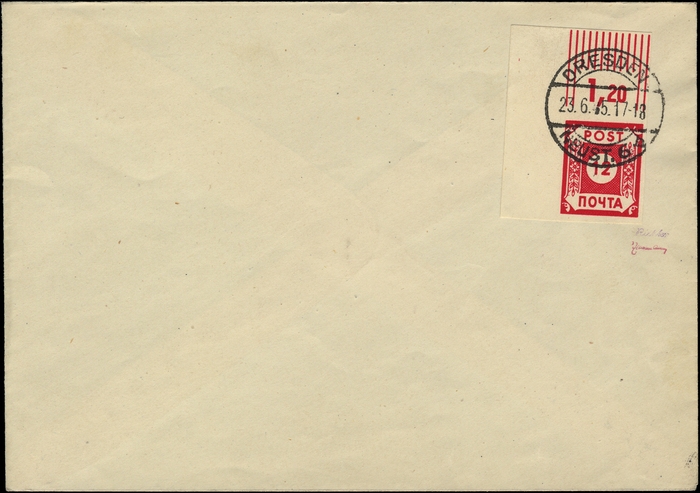 1945, 12 Pfg. Freimarke Ziffer als sogenannte "Potschta" aus der Bogenecke l.o. auf Blanco-Ersttagsbrief, signiert Richter u.a. (ME 800.-++)