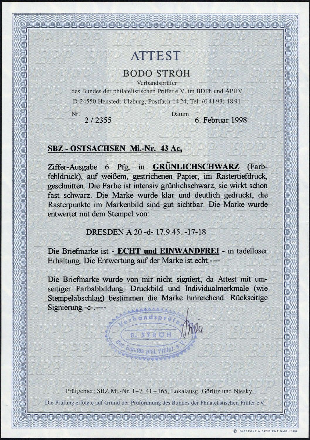 1945, 6 Pfg. Freimarke Ziffer echt und sauber gestempelt in der guten Farbe "grünschwarz" Type "Ac" in Luxuserhaltung, Farbfotoattest Ströh BPP "...echt und einwandfrei ..."